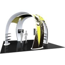 $39,998.00This organically-shaped, eye-catching structure allows for ample floor space for traffic flow, product demonstrations and engaging meetings. The 12.5′ tall, 16′ wide curved fabric arches provide areas within the space for shelving to display merchandise and products, as well as two areas for TVs to display digital media. One centrally-located fabric structure sits slightly underneath and in the middle of the two main arches, providing additional real estate for messaging and branding. Two canopy-like accent fabric structures connect the arches and are perfect areas for your company logo. Formulate Fusion 07 combines five lightweight tubular frame structures with zipper-pillowcase fabric graphics. Display shelves and monitors mounts are included; medium monitor mounts hold 40-50″ TVs up to 50 lbs.